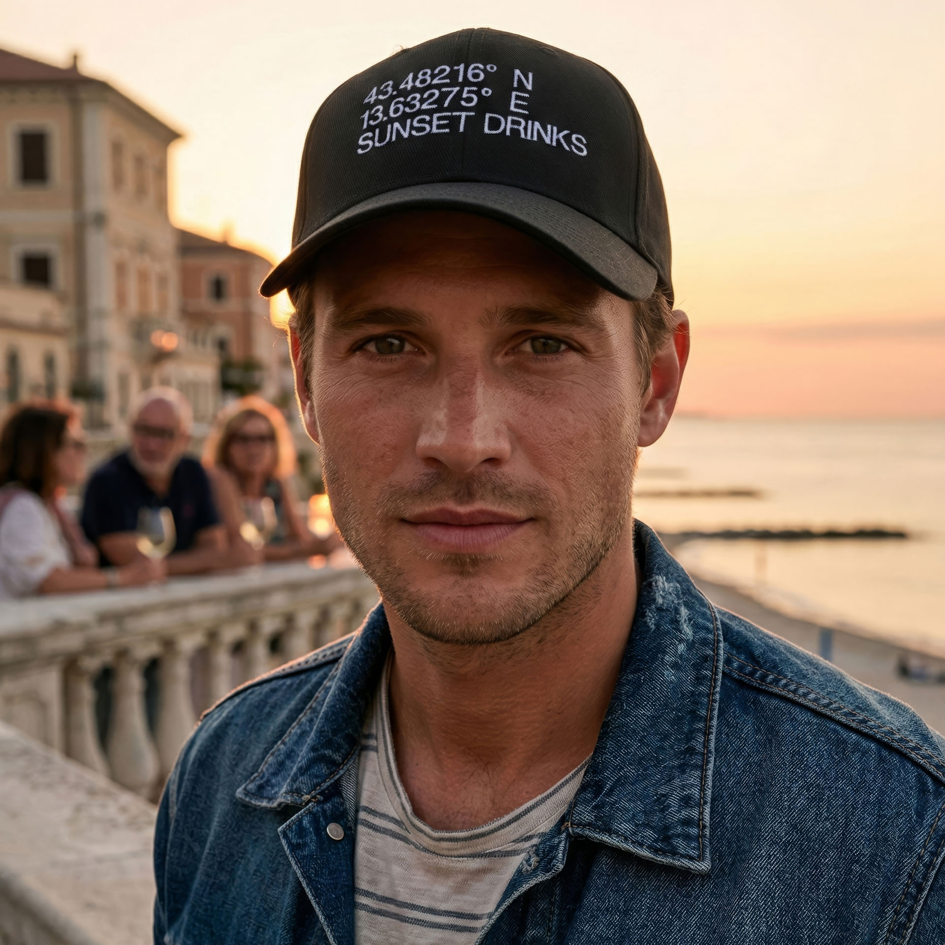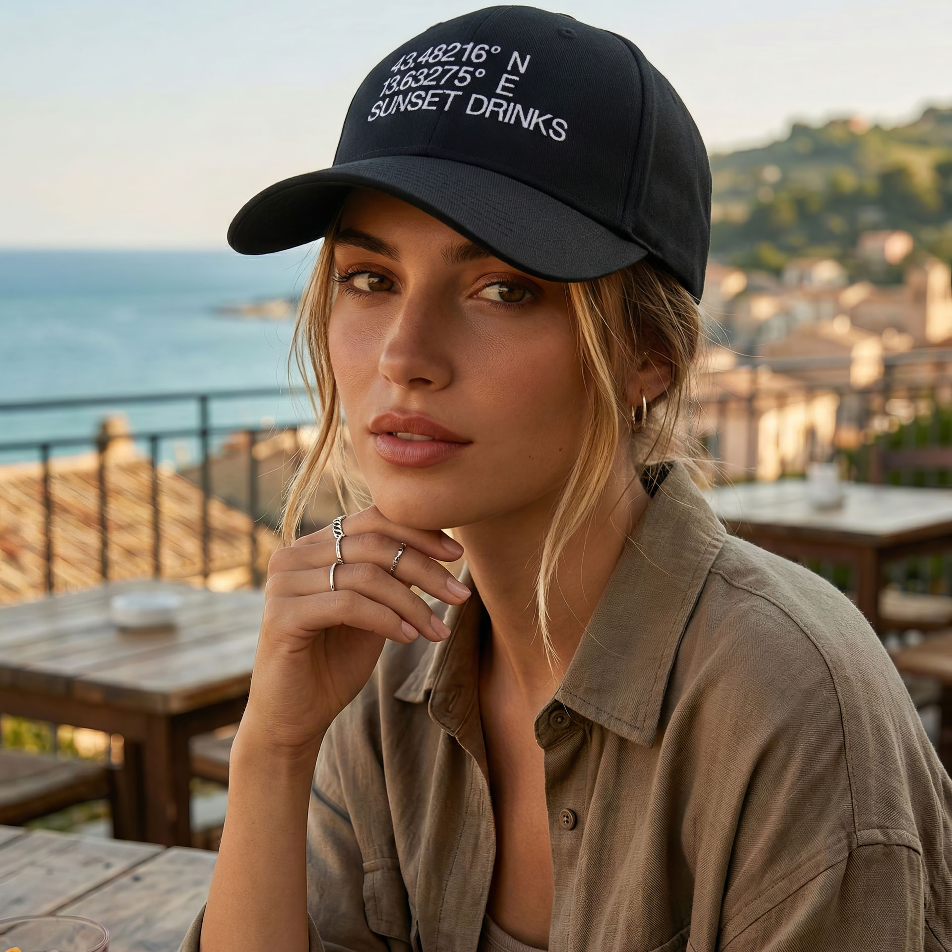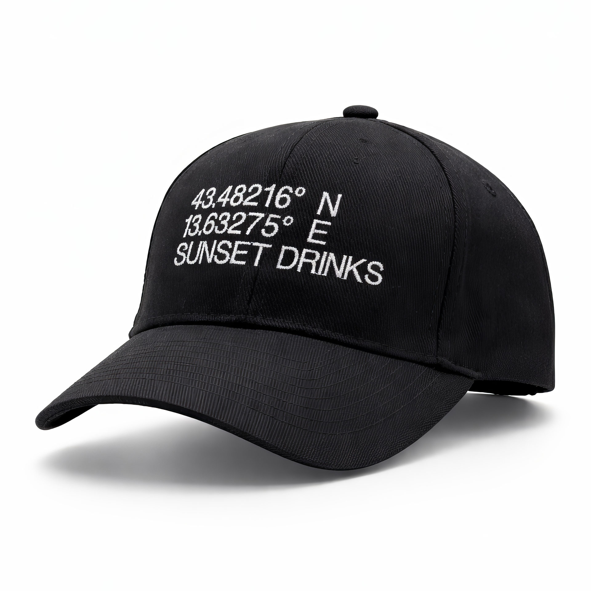 Ricamo frontale ad alta definizione con coordinate geografiche e firma “SUNSET DRINKS”, per uno stile riconoscibile anche senza logo.