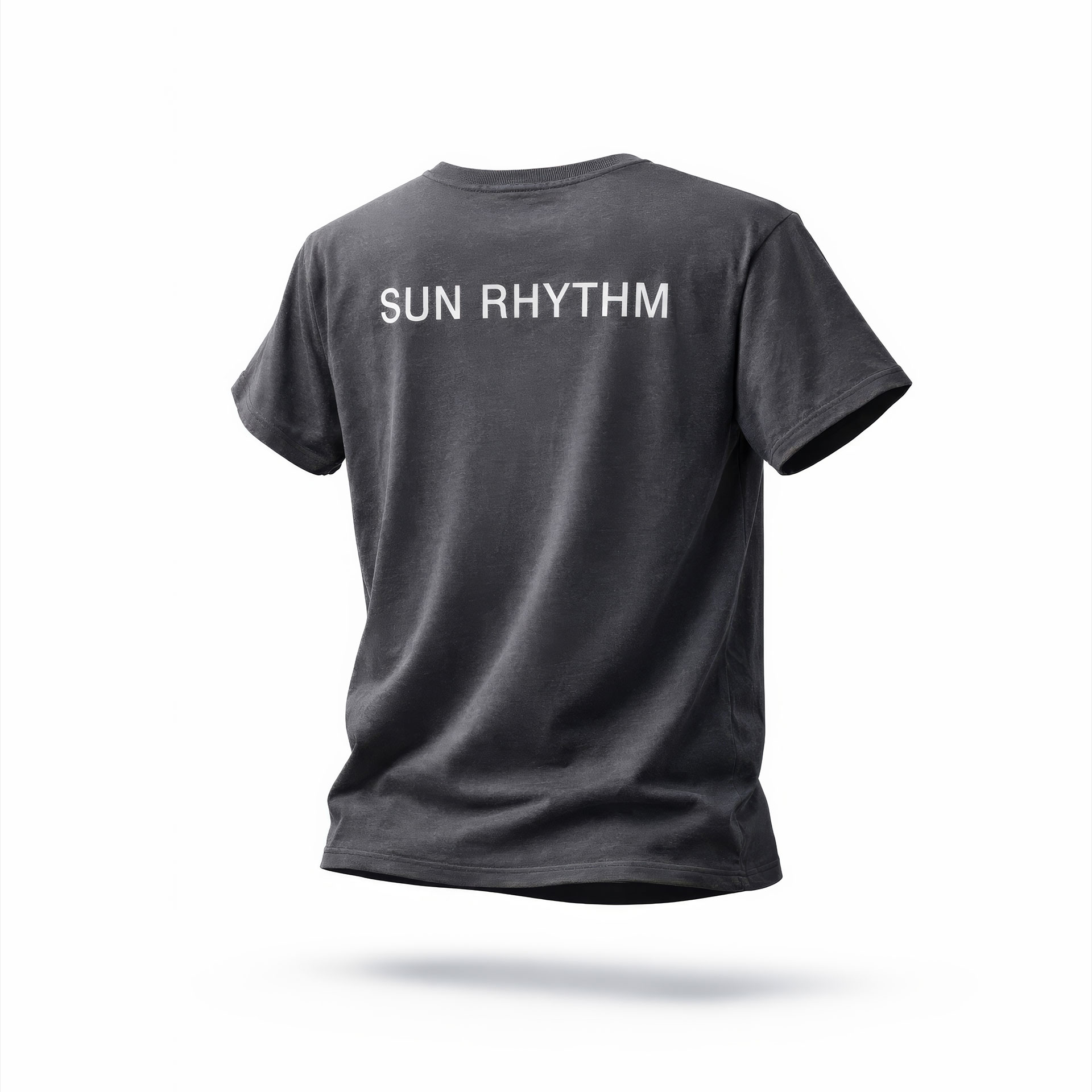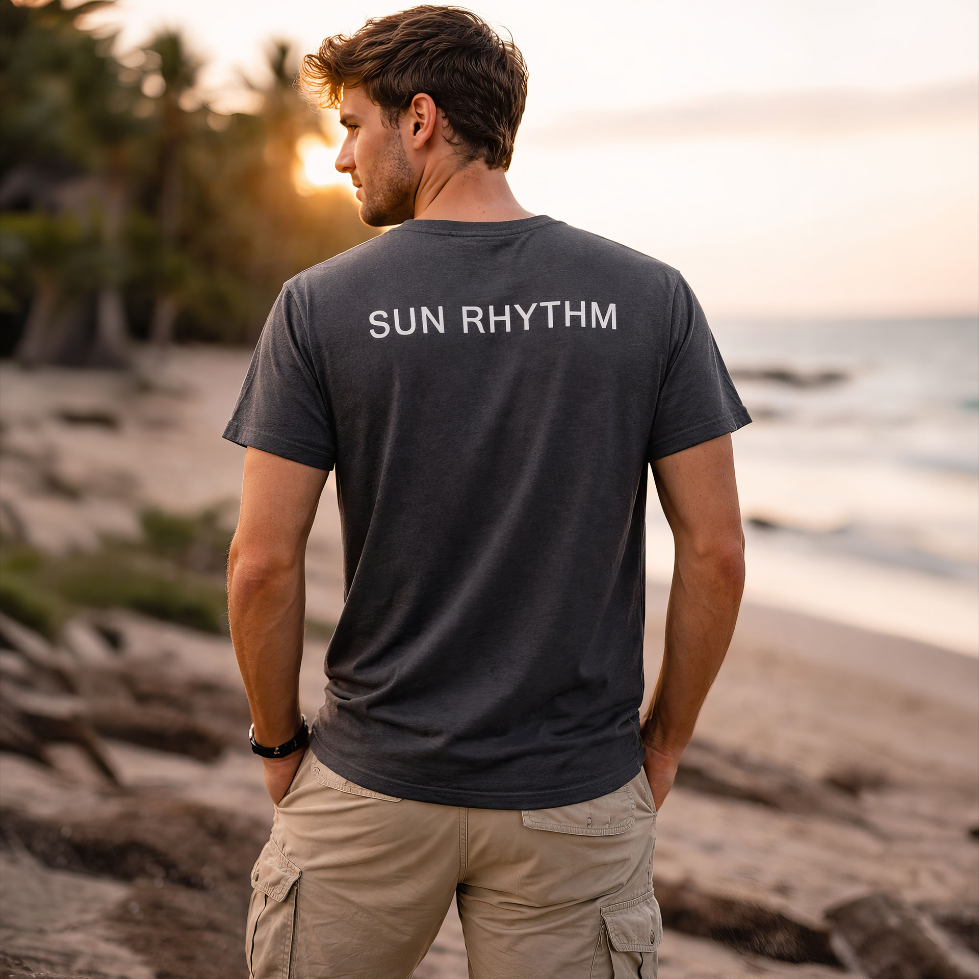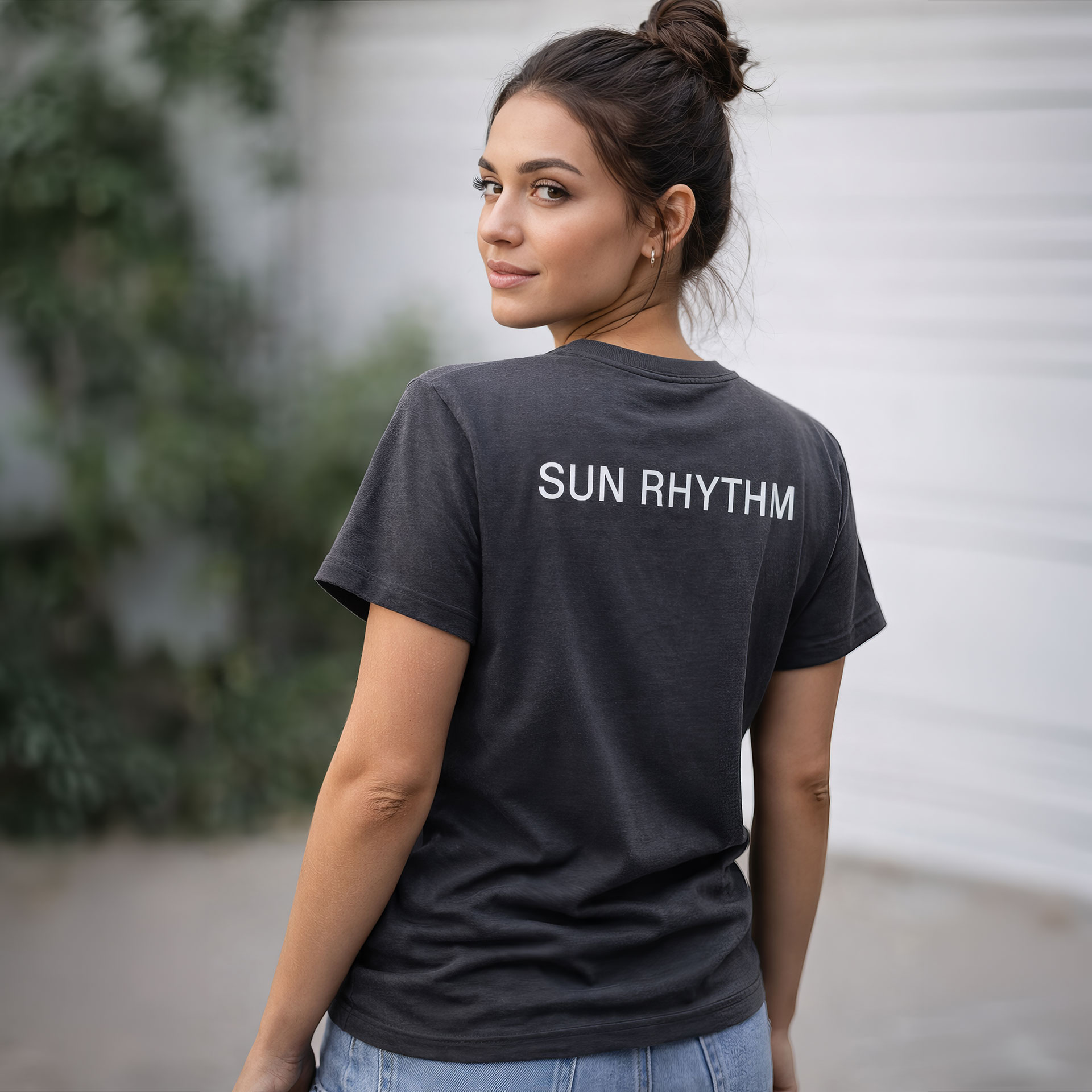 Design minimal con coordinate geografiche frontali e firma “SUN RHYTHM” sul retro, per uno stile iconico e immediatamente riconoscibile.